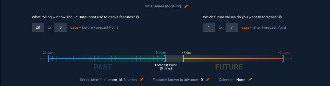 7. Customize the window settings (Feature Derivation Window (FDW) and Forecast Window (FW)) to configure how DataRobot derives features for the modeling dataset. Before modifying these values, see the detailed guidance for the meaning and implication of each window.