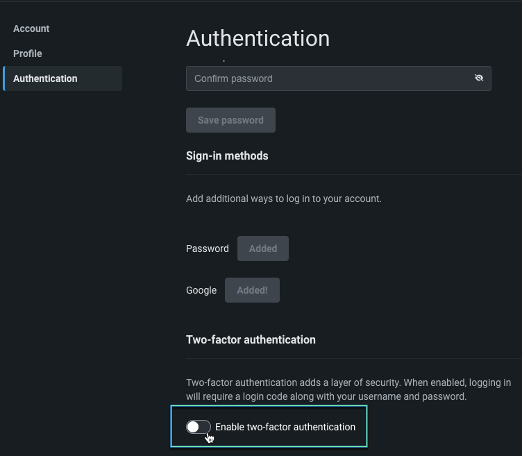 Click the Authentication tab from the User Settings page and switch the Two-Factor Authentication toggle to on: