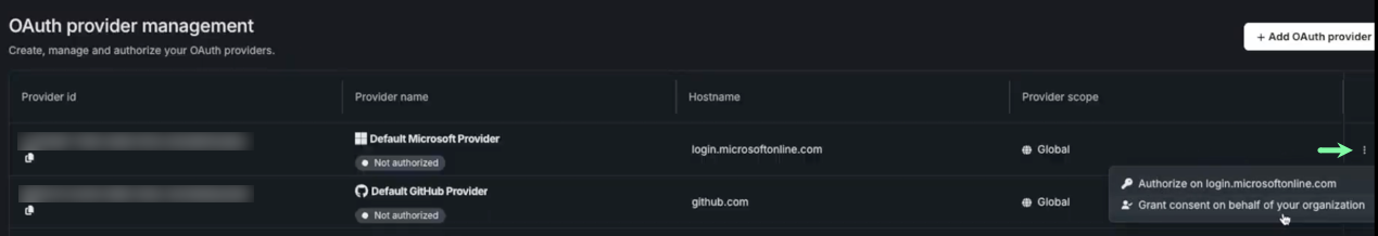 Click the Actions menu next to the OAuth provider you want to authorize and select Grant consent on behalf of your organization.