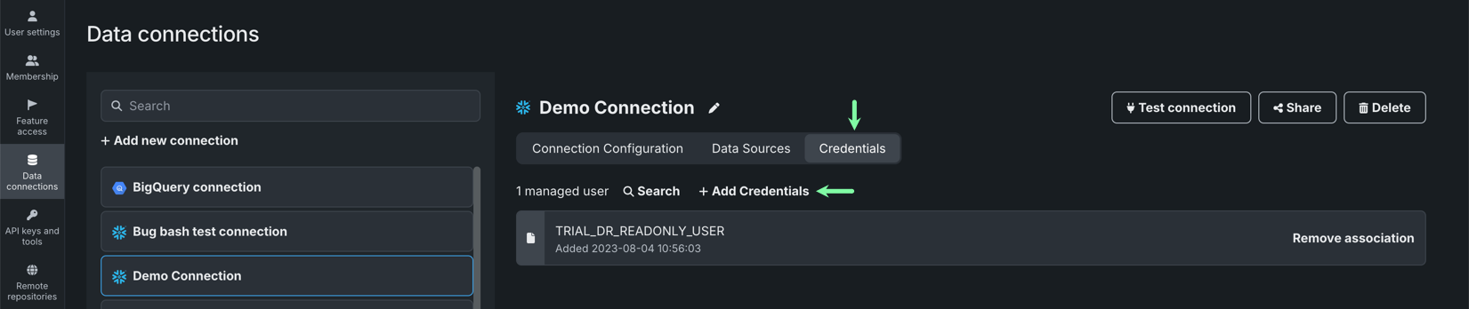 As an alternative to managing credentials from the Credentials management tile, you can also add and remove them from Data connections tile.