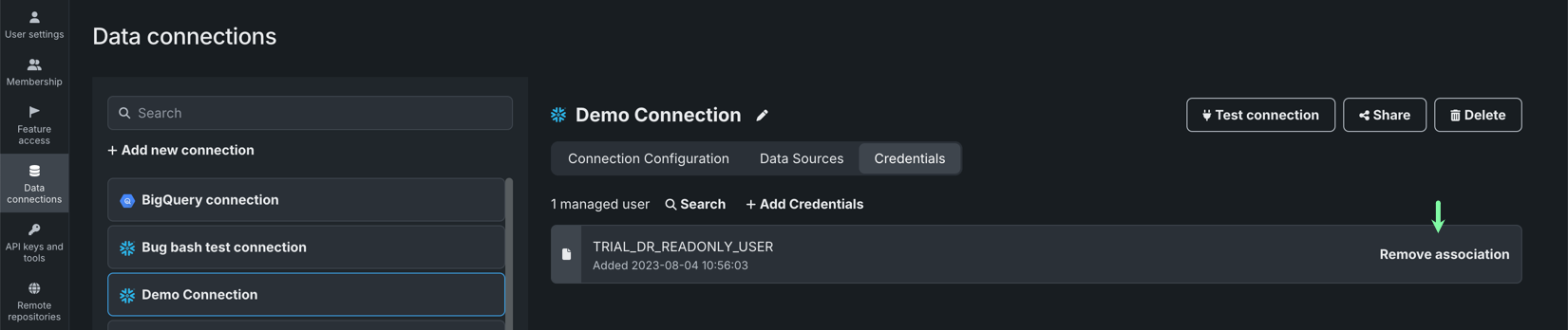 From the Data connections tile, select the connection with associated credentials, click the Credentials tab, and click Remove association.