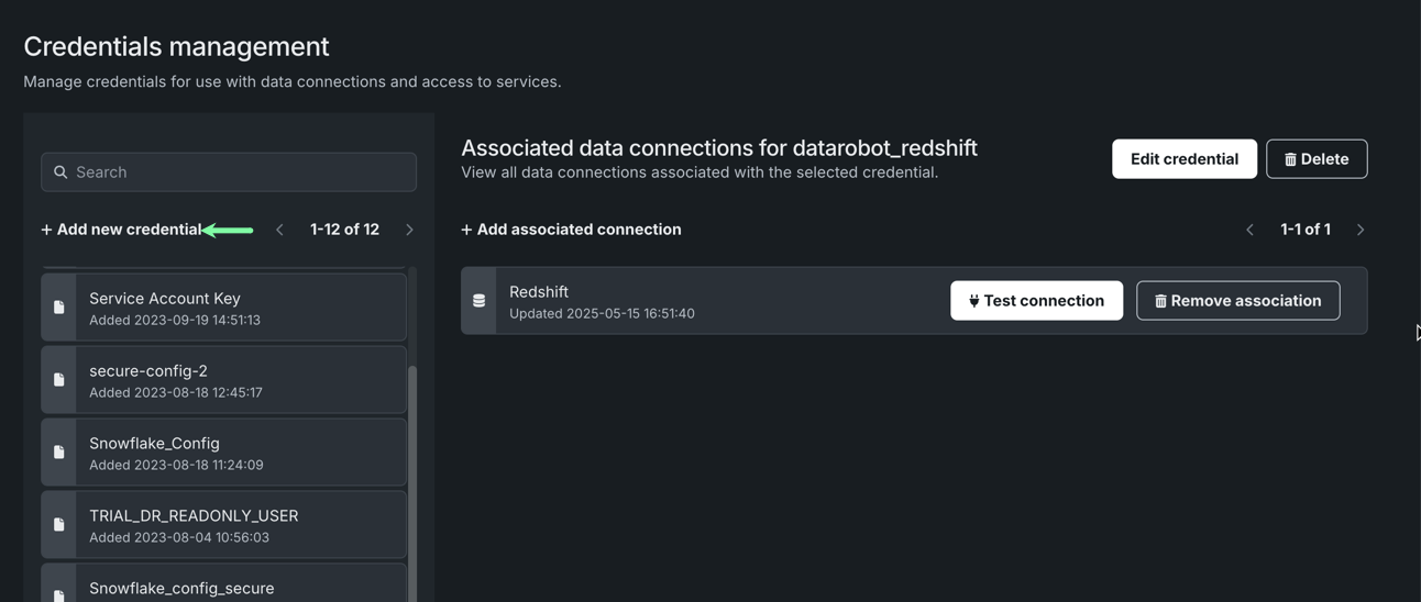 Because there is often a need to access secure data sources, DataRobot provides an option to securely store associated credentials for reuse. This capability is particularly useful for automating workflows that require access to secure sources or when combining many tables and sources that would each otherwise require individual authentication. The Credentials management tile is where you can create new stored credentials, edit or remove existing ones, and add or remove associations with data connections.