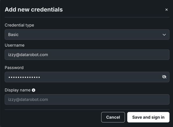 Enter a username and password, as well as an identifying label for the set (an account name), then click Save and sign in. The credential entry becomes available in the panel on the left.