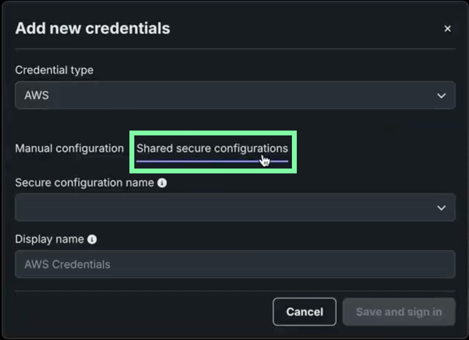 In the Add new credentials dialog box, select a Credential type, click the Shared secure configurations tab, then click Save and sign in.
