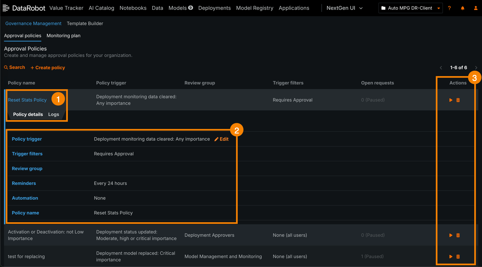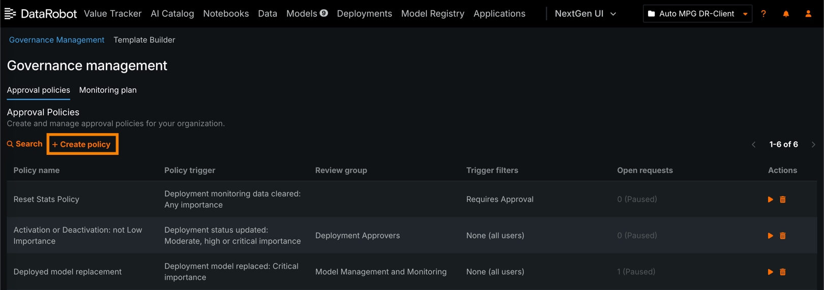 To create approval policies and a monitoring plan, navigate to the Governance management page: