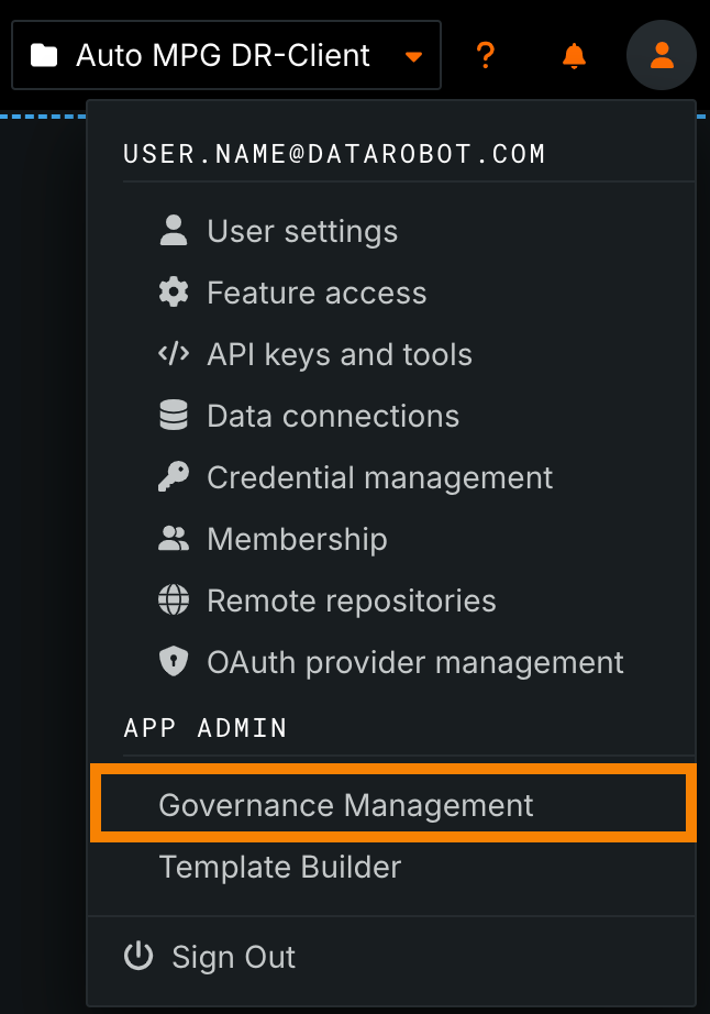 In the Classic UI, click the user icon and then, in the App Admin section, click Governance Management.