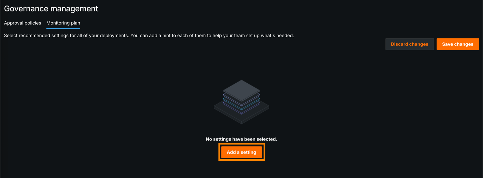 A deployment monitoring plan ensures the deployment owner is aware of the organization's requirements for deployment monitoring. Administrators can create a monitoring plan for deployments from the Governance management > Monitoring plan page. The defined monitoring plan appears in the Setup checklist panel on the deployment Overview. If a monitoring plan isn't defined, the checklist includes all available deployment settings. If a monitoring plan is defined, the checklist includes the settings defined in the monitoring plan and any additional guidance provided when you configured the checklist. Each setting in the checklist panel also includes the status of the setting: Not enabled, Partially enabled, or Enabled. Deployment owners can click a tile in the checklist to open the relevant deployment setting page and configure the required settings.