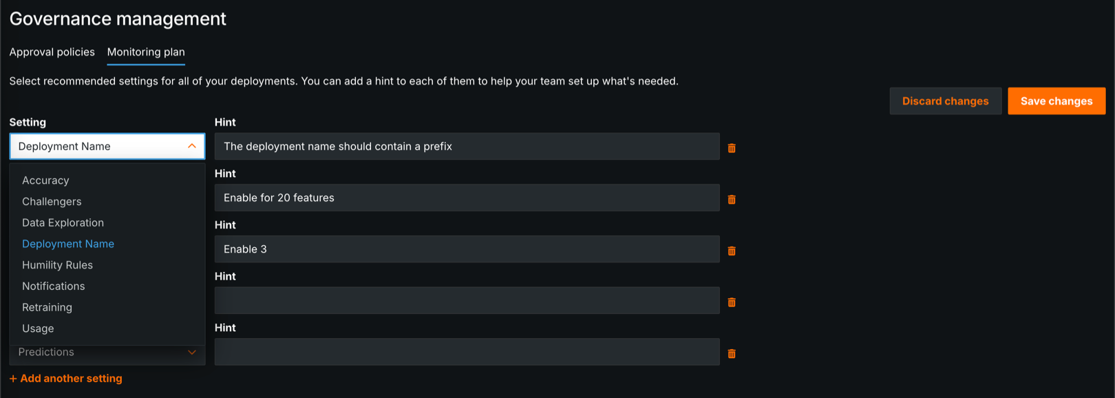 To enable effective governance of the model deployment, administrators can create approval policies for deployment-related activities and a monitoring plan to provide guidance on deployment configuration requirements.