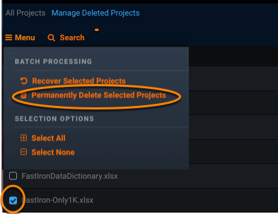 - Deleting multiple projects at one time—select the checkbox for each project to delete, or from Menu choose Select All (to delete all projects).