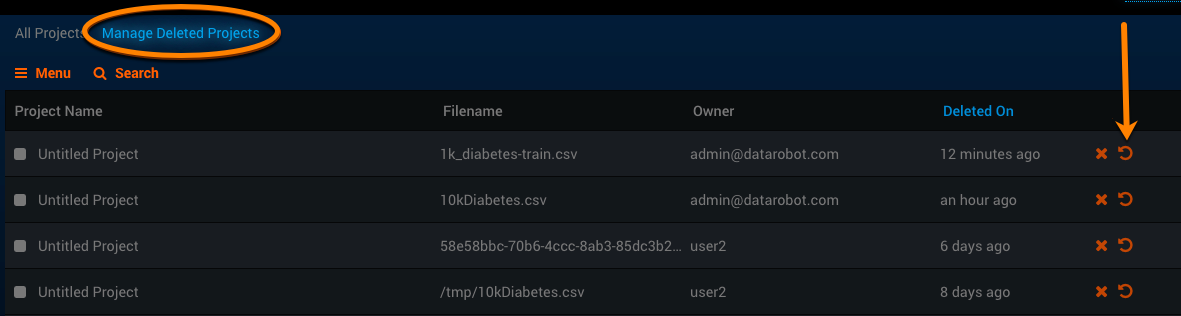 The Manage Deleted Projects tab shows all deleted projects for all users.