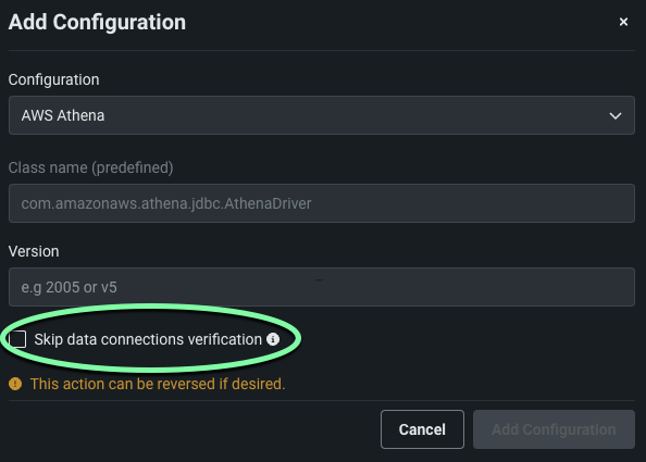 If there are existing connections to the driver and the new configuration will affect the JDBC URLs (and you still want to make this change), select Skip data connections verification. This ensures DataRobot does not validate JDBC URLs for existing data connections.