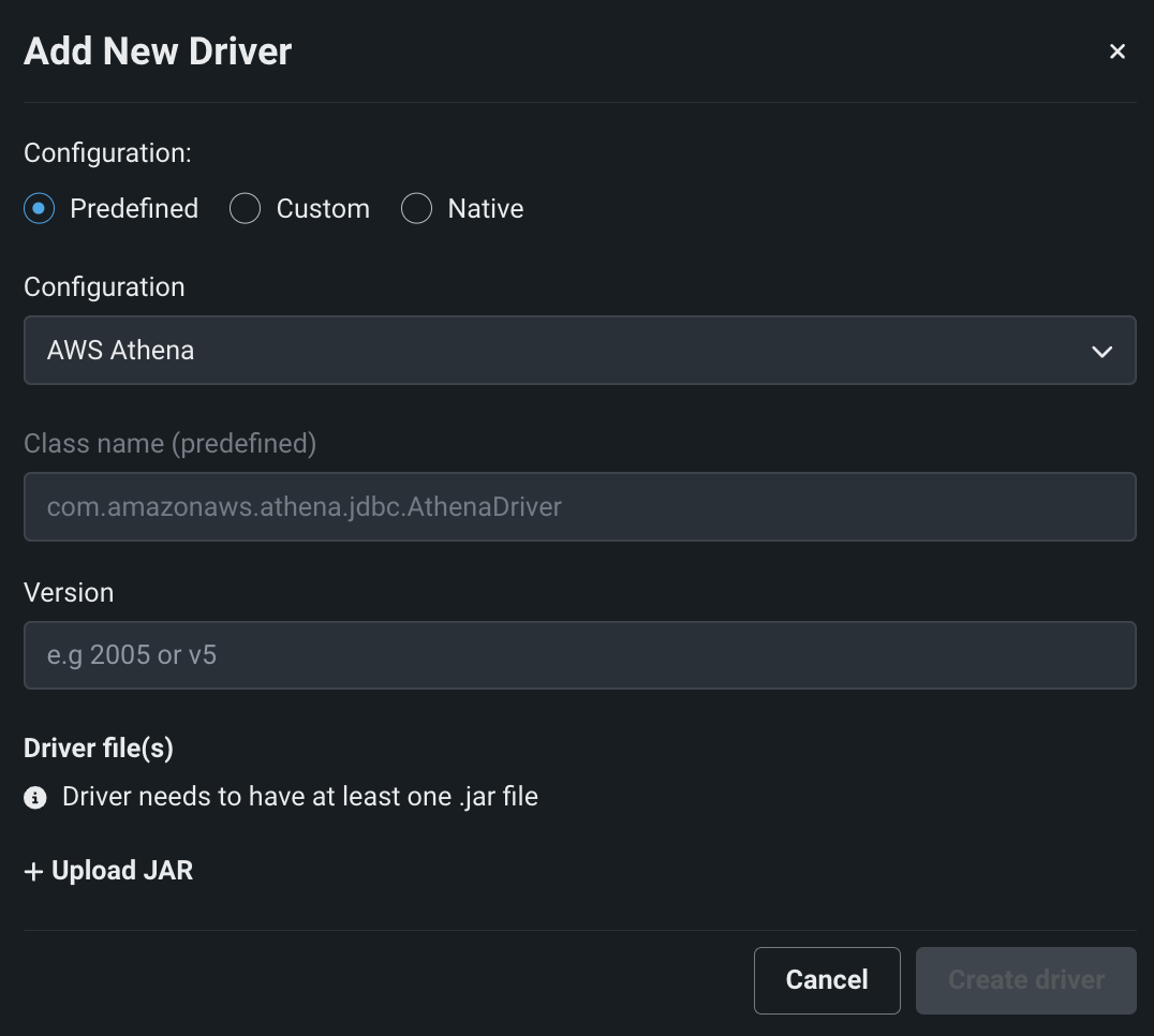 Field Description Driver name Enter a display name for the driver. Class name Enter the driver class name. If unknown, refer to the driver documentation. Driver Files * Click + UPLOAD JAR to add the driver JAR file. Follow the same process for each additional library dependencies. When uploaded successfully, the JAR filename(s) appear in this field. * The JAR driver and dependency file size limit is 100MB. That is, each file upload can be a maximum of 100MB, but totals may exceed that limit.