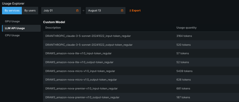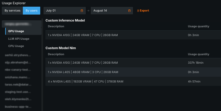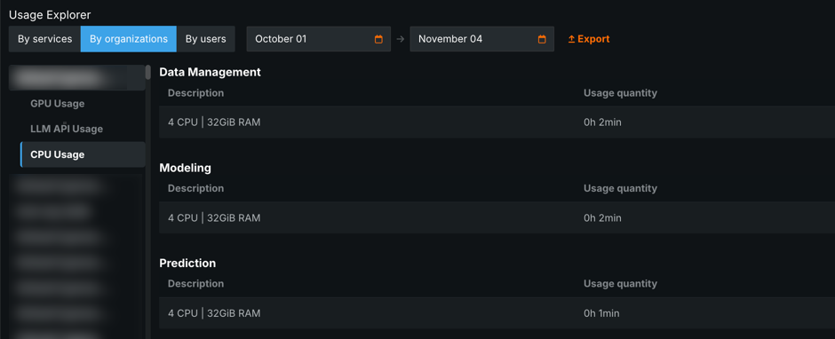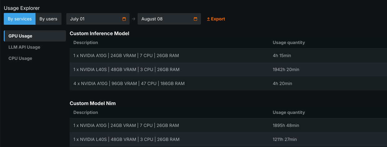 The Usage Explorer provides org admins visibility into the organization's graphics processing unit (GPU), central processing unit (CPU), and large language model (LLM) API usage across the platform, providing general usage information broken down by service or user. Monitoring these resources over time can help indicate whether the organization has the correct number of resources to meet usage needs.