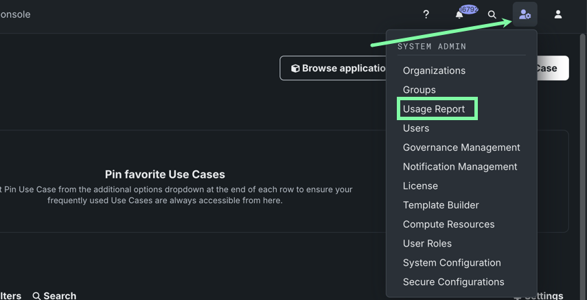 The Usage report provides system admins visibility into the organization's graphics processing unit (GPU) and central processing unit (CPU) usage across the platform.