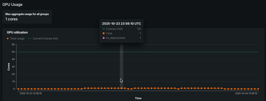 | GPU utilization chart | A chart that displays total usage amount over the specified time period, as well as your organization's current license limit for core usage. Hover over a point on the chart to to view additional information. |