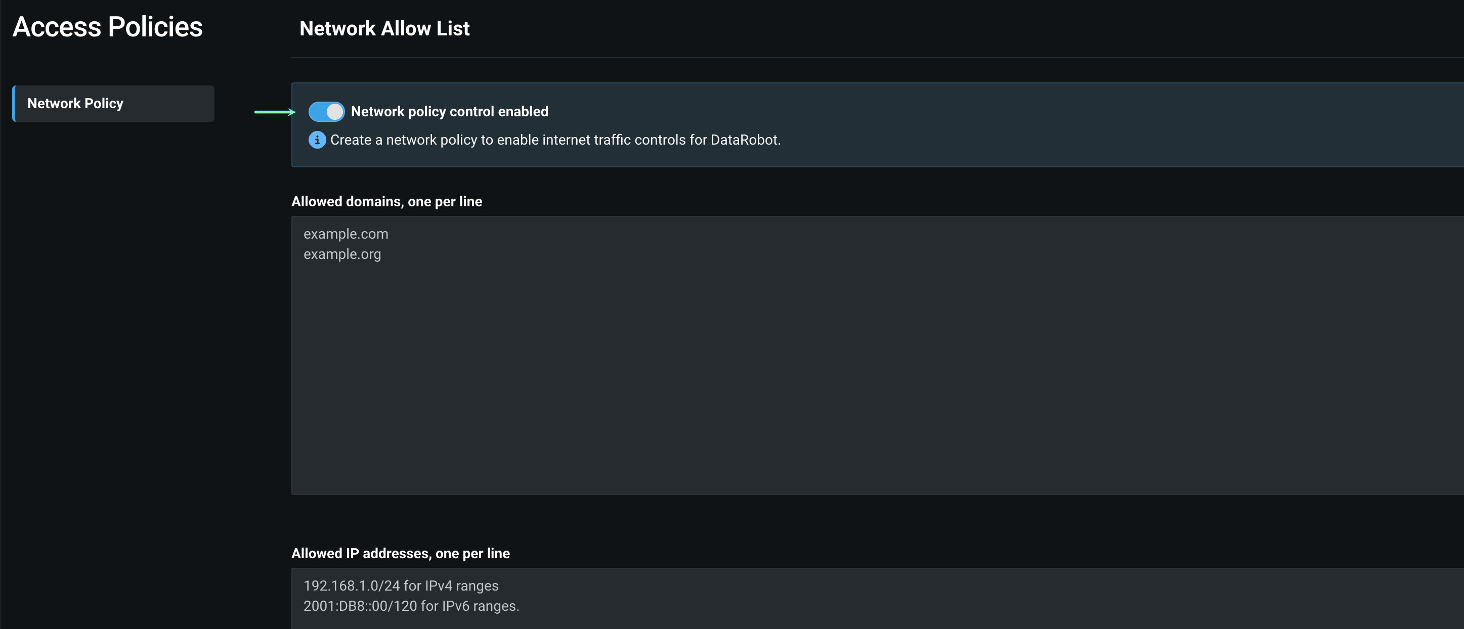 Enable the toggle to the left of Enable network policy control. When this toggle is enabled, by default, users cannot access public resources from within DataRobot.