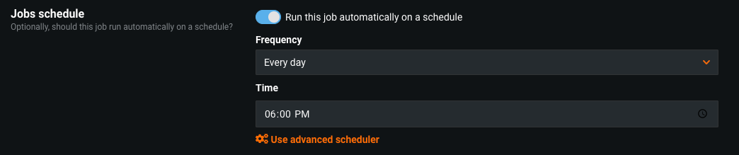 | 6 | Jobs schedule | Toggle whether to run the job immediately and whether to schedule the job. |