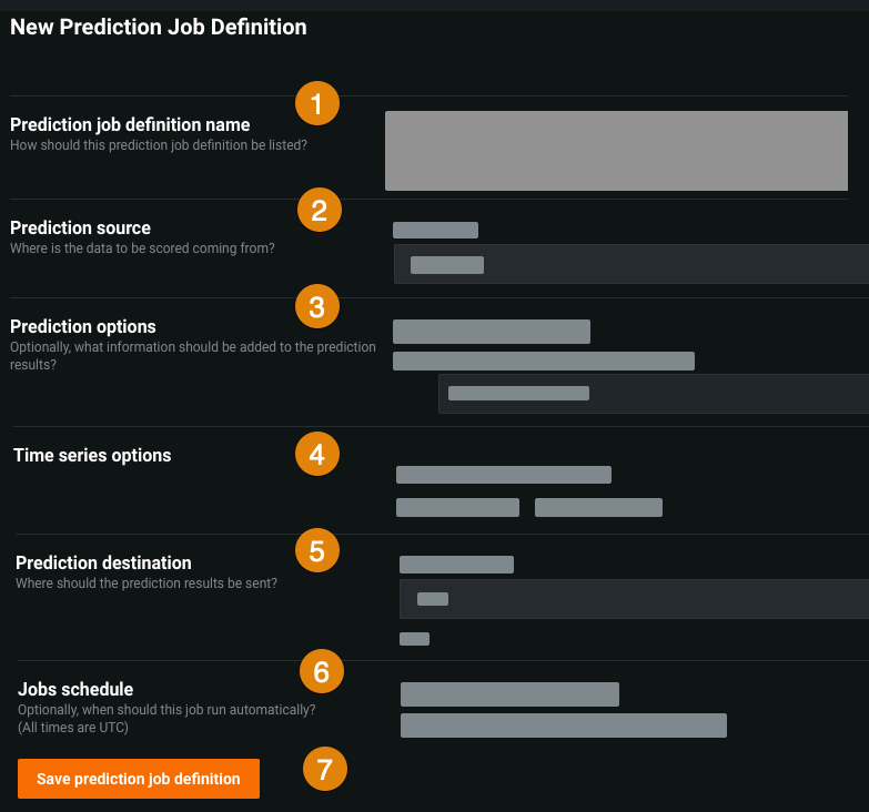 | 7 | Save prediction job definition | Click this button to save the job definition. The button changes to Save and run prediction job definition if the Run this job immediately toggle is turned on. Note that this button is disabled if there are validation errors. |