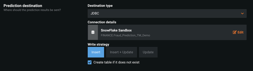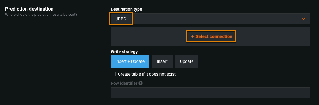 For Prediction source, select JDBC as the Destination type and click + Select connection.