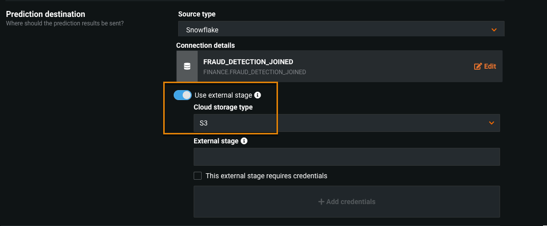 For Prediction destination, select Snowflake as the Destination type and click + Select connection.