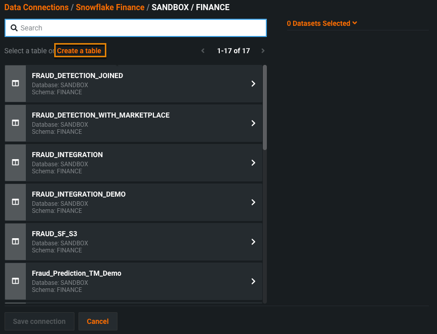 Select a table or create a new table. If you create a new table, DataRobot creates the table with the proper features, and assigns the correct data type to each feature.