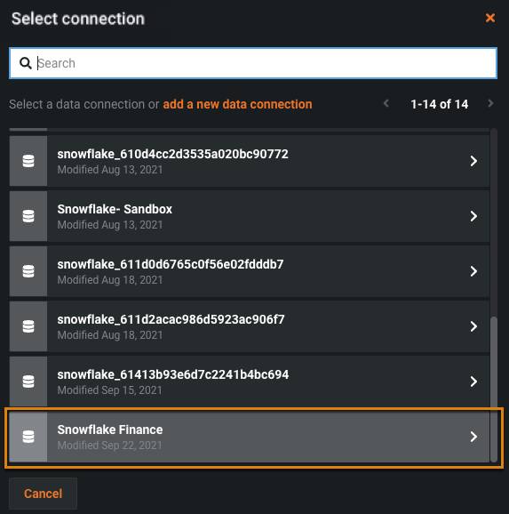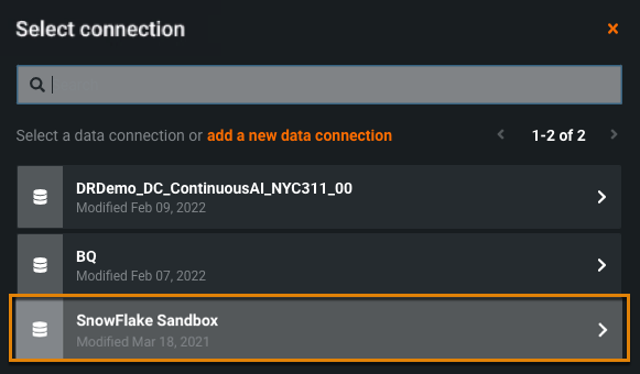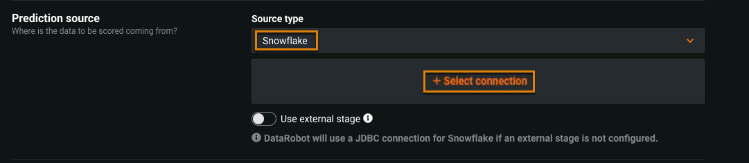 For Prediction source, select Snowflake as the Source type and click + Select connection.