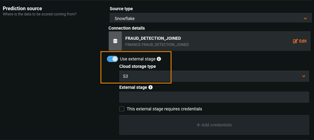 Enter the External stage you created for your Snowflake account. Enable This external stage requires credentials and click + Add credentials.