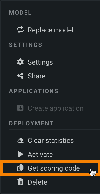 • Open the deployment's Actions menu and click Get scoring code.