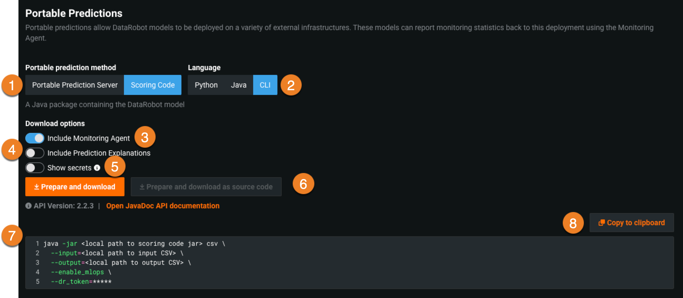 8 Copy to clipboard Copies the Scoring Code example to your clipboard so that you can paste it in your IDE or on the command line.