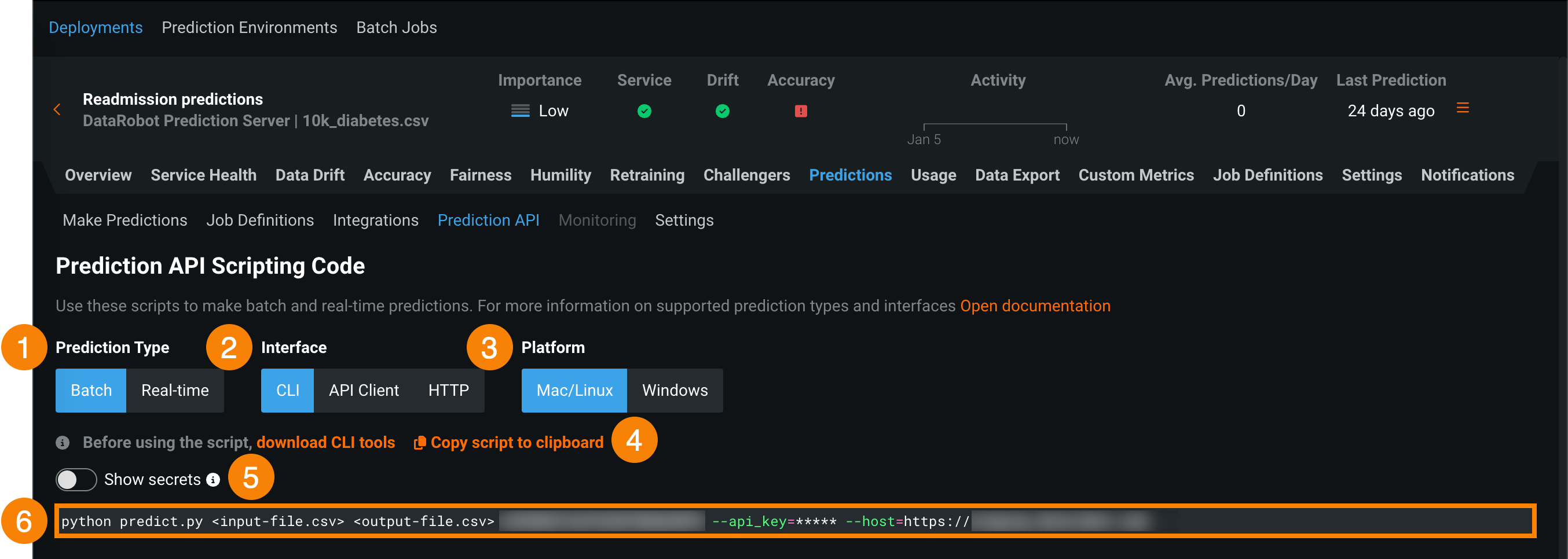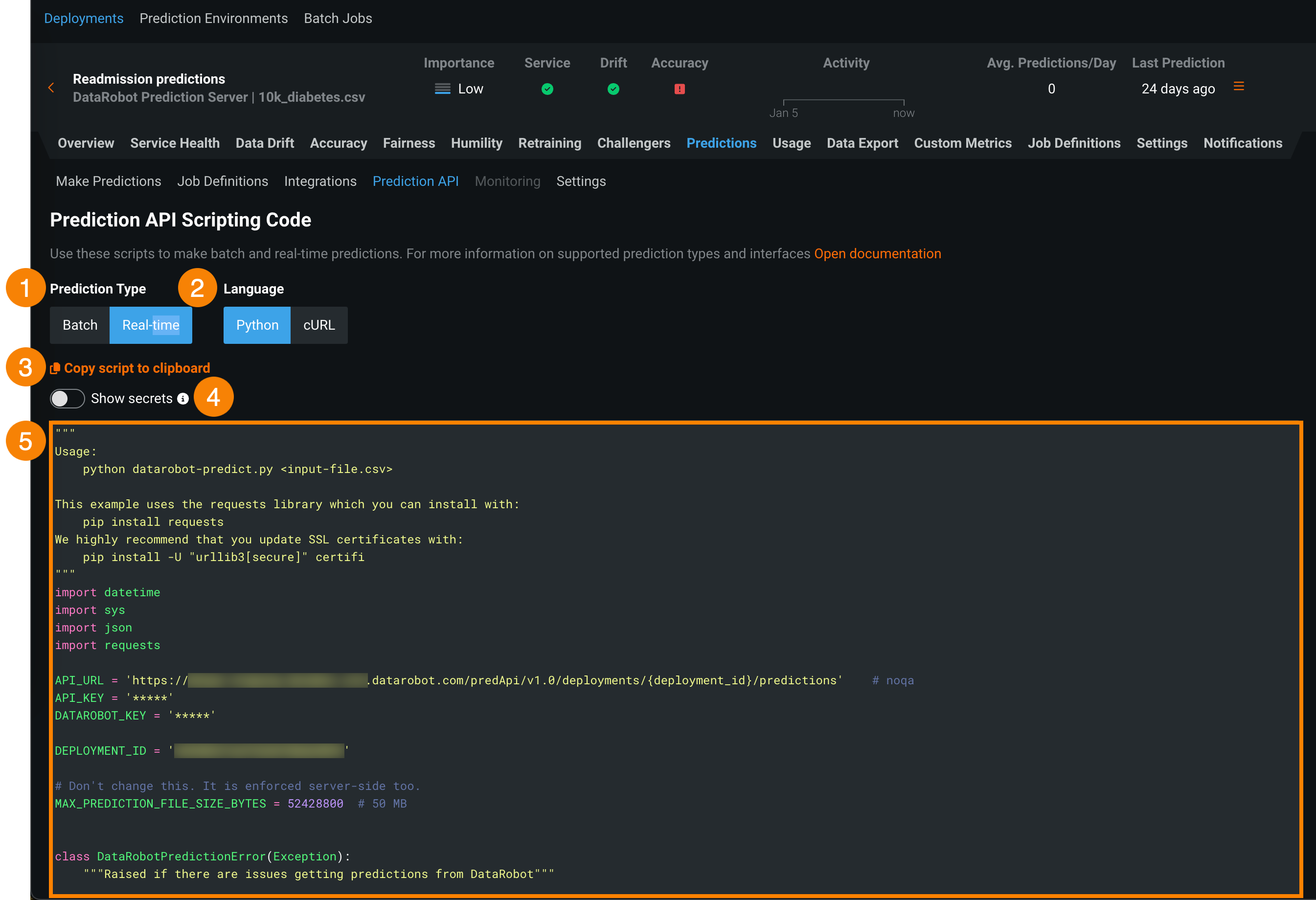 | 4 | Show secrets | Displays any secrets hidden by ***** in the code snippet. Revealing the secrets in a code snippet can provide a convenient way to retrieve your API key or datarobot-key; however, these secrets are hidden by default for security reasons, so ensure that you handle them carefully. |