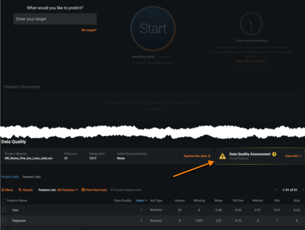 Once EDA1 completes, the Data Quality Assessment appears just above the feature listing on the Data page.