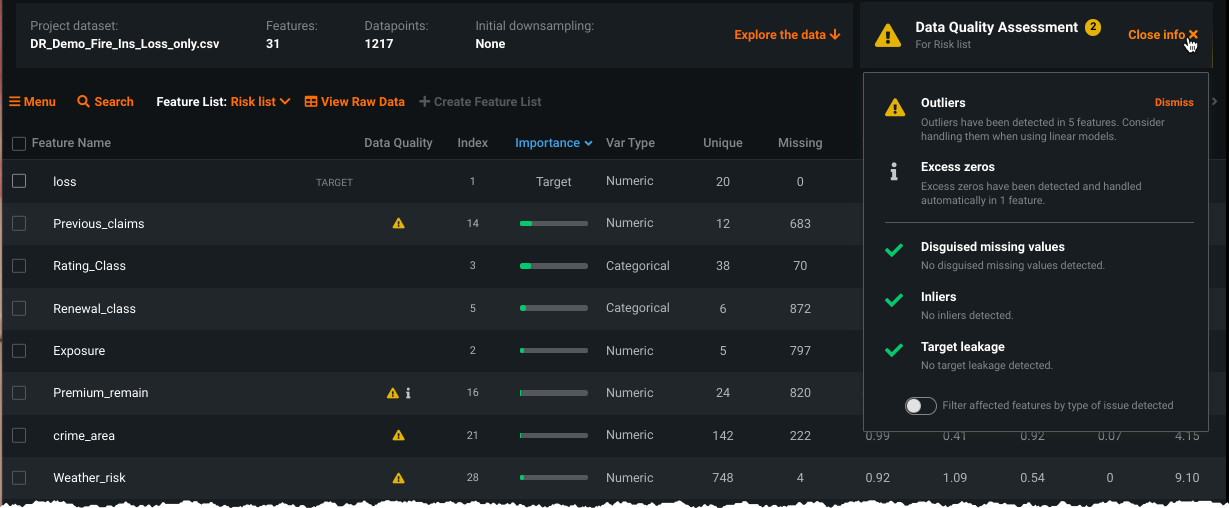 The Data Quality Assessment provides information about data quality issues that are relevant to your stage of model building. Initially run as part of EDA1 (data ingest), the results report on the All Features list. It runs again and updates after EDA2, displaying information for the selected feature list (or, by default, All Features). For checks that are not applicable to individual features (for example, Inconsistent Gaps), the report provides a general summary. Click View Info to view (and then Close Info to dismiss) the report:
