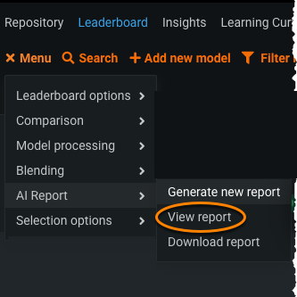 To generate an AI Report for your Autopilot run, on the Leaderboard, click Menu and select AI Report > Generate new report.