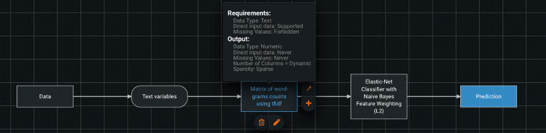 Hover over either the Matrix of word-grams counts or Elastic-Net Classifier nodes to see:
