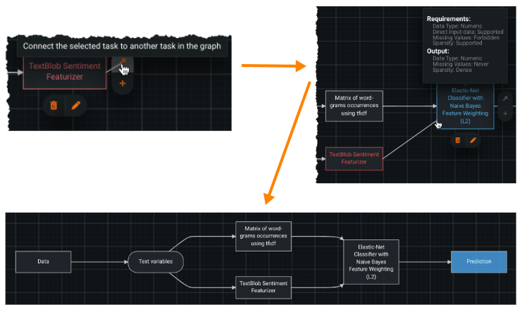 To capture sentiments in a text feature for this example, hover over the Text variables node and click the task selector plus sign (