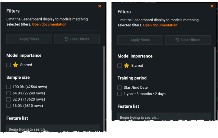 Use the Filters selection box to modify the Leaderboard display to match only those models matching the selected criteria. Available fields, and the settings for that field, are dependent on the project and/or model type. For example, non-date/time models offer sample size filtering while time-aware models offer training period:
