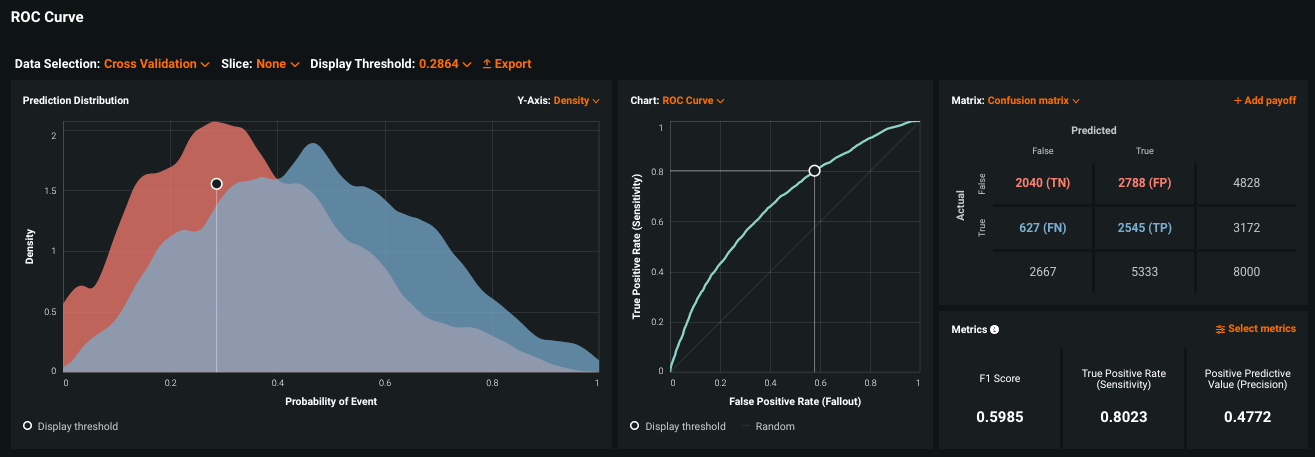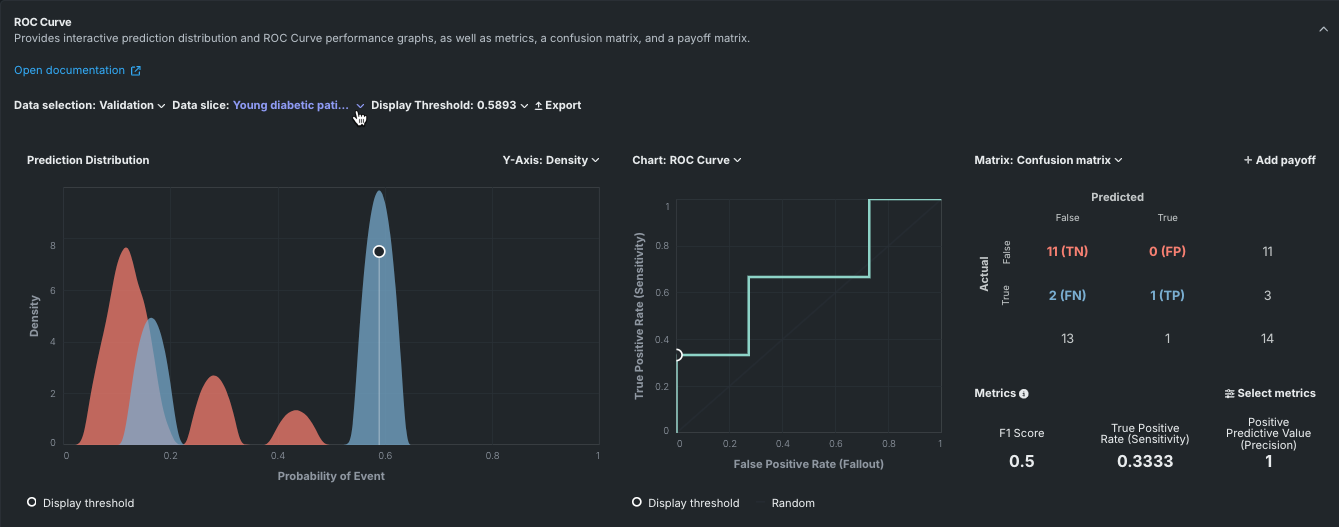 If the slice results in predictions that are either all positive or all negative, the ROC curve will be a straight line. The Confusion Matrix reports the same results in table form.