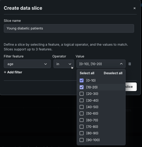 Slices are not available in projects created with SHAP Feature Importance and SHAP-based Prediction Explanations.