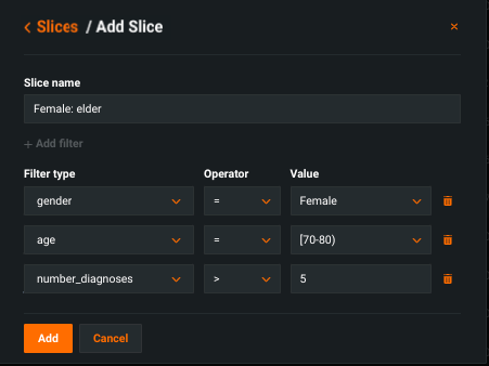 Consider the same model with a slice applied that segments the data for females aged 70-80 who have had more than five diagnoses: