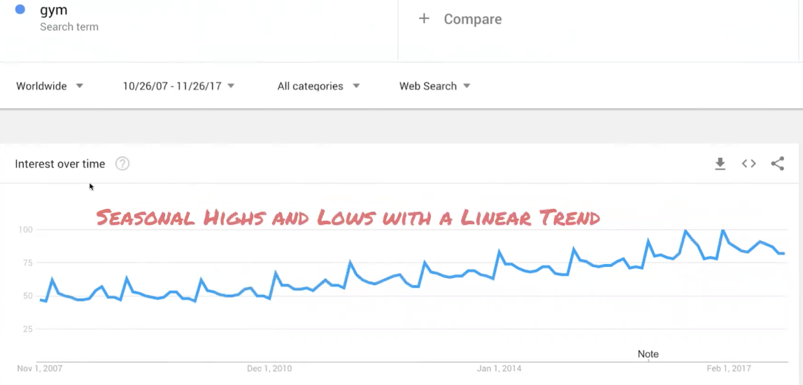 Combinations: Data can combine patterns as well. Consider searching the term "gym." Search interest spikes every January with lows over the holidays. Interest, however, increases over time. In this example you can see both seasonality with linear a trend:
