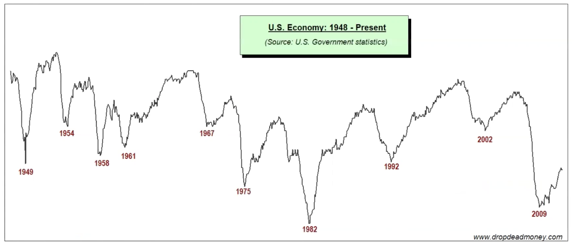 Cycles: Cycles are similar to seasonality, except that they do not necessarily have a fixed period and are generally require a minimum of four years of data to be qualified as such. Usually related to global macroeconoimc events or changes in the political landscapes, cycles can be seen as a series of expansions and recessions: