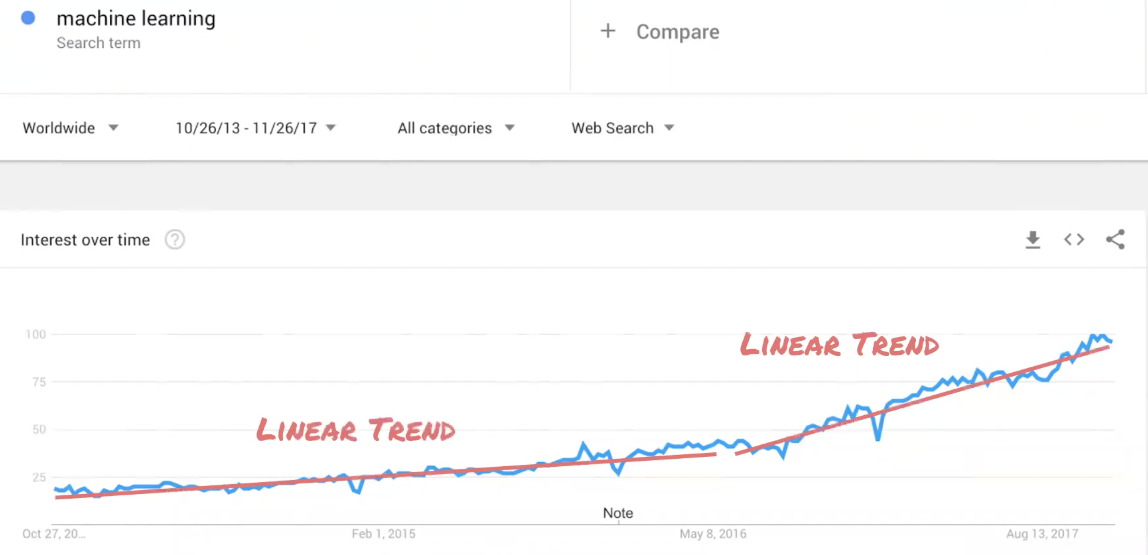 Linearity : A specific type of trend. Searching on the term "machine learning," you see an increase over time. The following shows the linear trends (you can also view as a non-linear trend) created by the search term, showing that interest may fluctuate but is growing over time: