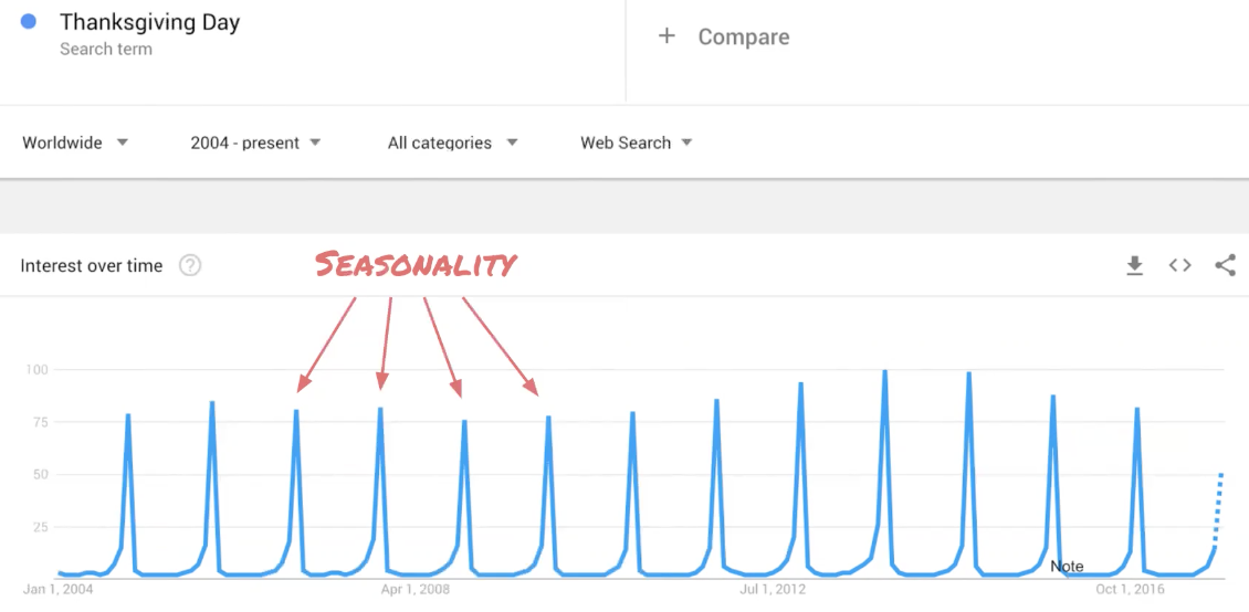 Seasonality: Searching on the term "Thanksgiving" shows periodicity. In other words, spikes and dips are closely related to calendar events (for example, each year starting to grow in July, falling in late November):