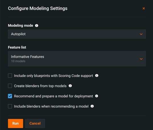 The first modeling run, using Quick mode, generated results by exploring a limited set of available blueprints. There are, however, many more available if you run in Comprehensive mode. Click Configure modeling settings option in the right pane, and select Comprehensive modeling mode, to re-run the modeling process and build additional models while prioritizing accuracy.