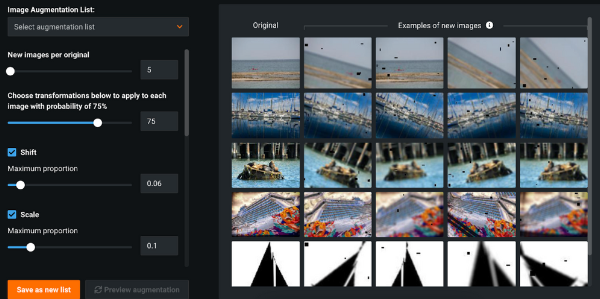 Following featurizer tuning, you can explore changes to your input data with image augmentation to improve model accuracy. By creating new images for training by randomly transforming existing images, you can build insightful projects with datasets that might otherwise be too small.