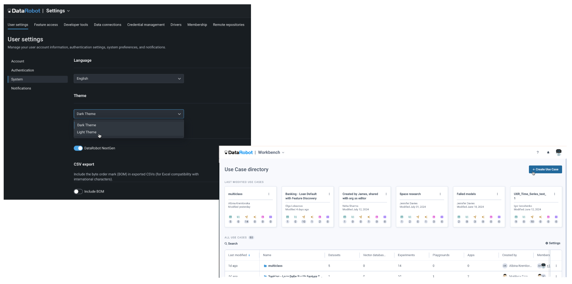 You can now change the display theme of the DataRobot application, which displays in the dark theme by default. To change the color of the display, from your profile avatar in the upper-right corner, navigate to User Settings > System and use the Themes dropdown: