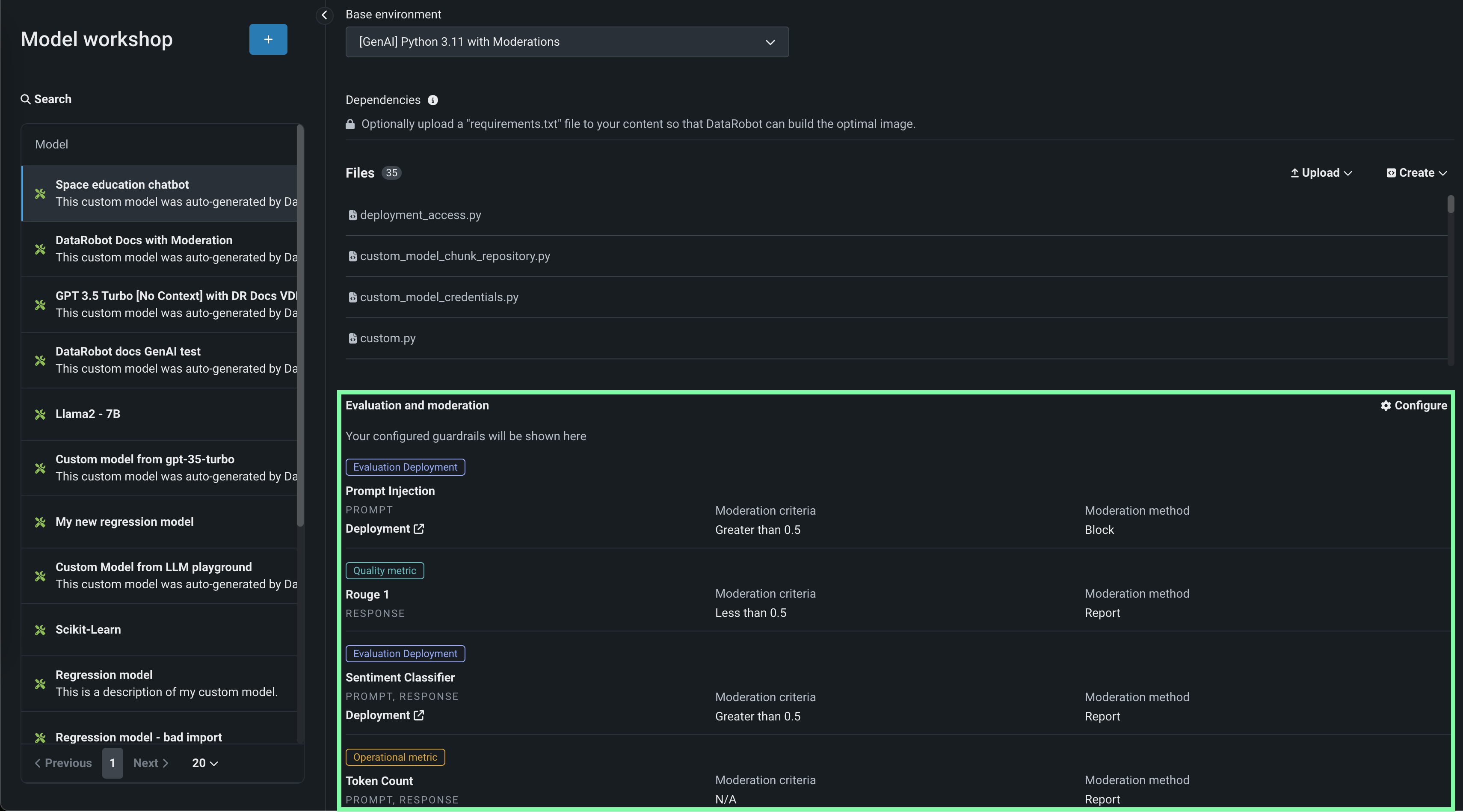 Evaluation and moderation guardrails help your organization block prompt injection and hateful, toxic, or inappropriate prompts and responses. It can also prevent hallucinations or low-confidence responses and, more generally, keep the model on topic. In addition, these guardrails can safeguard against the sharing of personally identifiable information (PII). Many evaluation and moderation guardrails connect a deployed text generation model (LLM) to a deployed guard model. These guard models make predictions on LLM prompts and responses and then report these predictions and statistics to the central LLM deployment. To use evaluation and moderation guardrails, first, create and deploy guard models to make predictions on an LLM's prompts or responses; for example, a guard model could identify prompt injection or toxic responses. Then, when you create a custom model with the Text Generation target type, define one or more evaluation and moderation guardrails. The GA Premium release of this feature introduces general configuration settings for moderation timeout and evaluation and moderation logs.