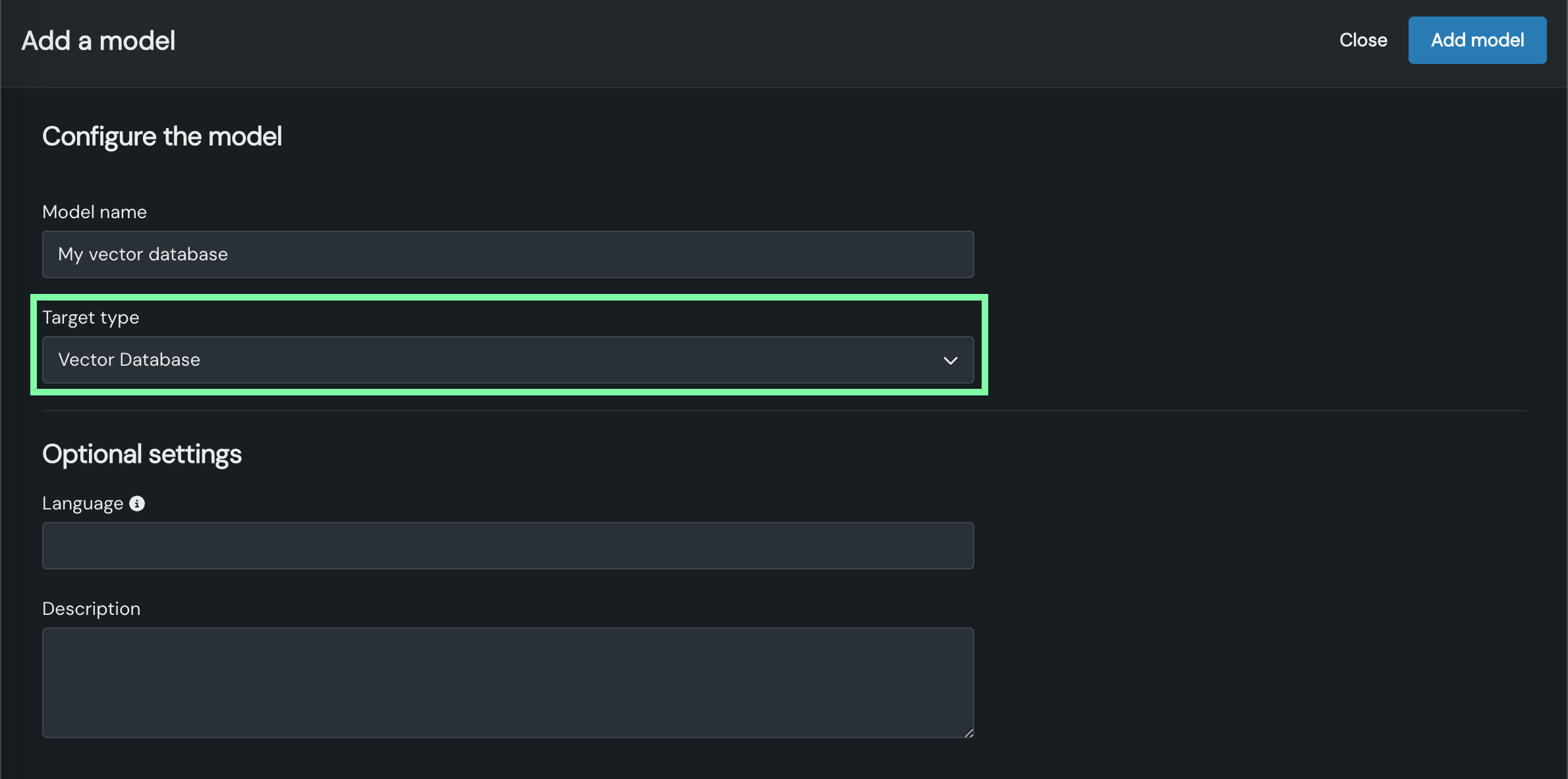 With the vector database target type in the model workshop, you can register and deploy vector databases, as you would any other custom model.