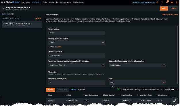For some time series, when the dataset is detected as irregular, DataRobot only allows row-based mode. Loss of time-based mode can result in significant gaps in some series. The time series data prep tool, available from the AI Catalog, provides a solution to this issue. It allows you to aggregate a dataset to a specified time step and impute the target for any missing rows. You can modify the dataset using either a selector-based method (Manual) or an editable Spark SQL query and then save the new dataset back to the AI Catalog as a Spark asset.