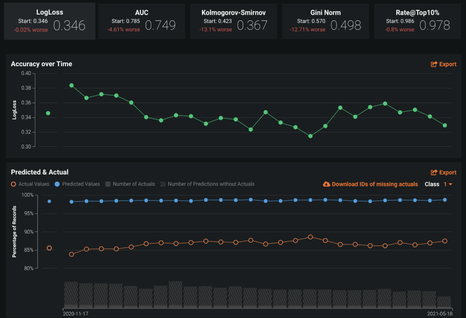 Binary classification models deployed to remote environments can now be registered with Holdout data, allowing external deployments to calculate additional drift and accuracy baselines previously only available to models built with DataRobot AutoML. When monitoring accuracy, you can now compare the current accuracy calculation to the baseline at the time of training the model. Additionally, target drift now supports more detailed drift analysis using prediction values prior to the application of the prediction threshold.